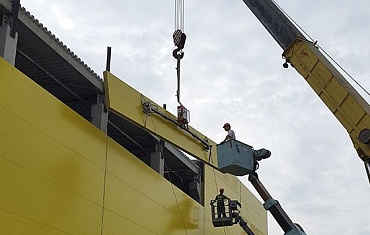 Вакуумными захватами ARLIFTER SP-4 / SPD-4 выполнен монтаж сэндвич-панелей на строительстве гипермаркета крупнейшей российской торговой сети «Лента». На этот раз в городе Челябинск.