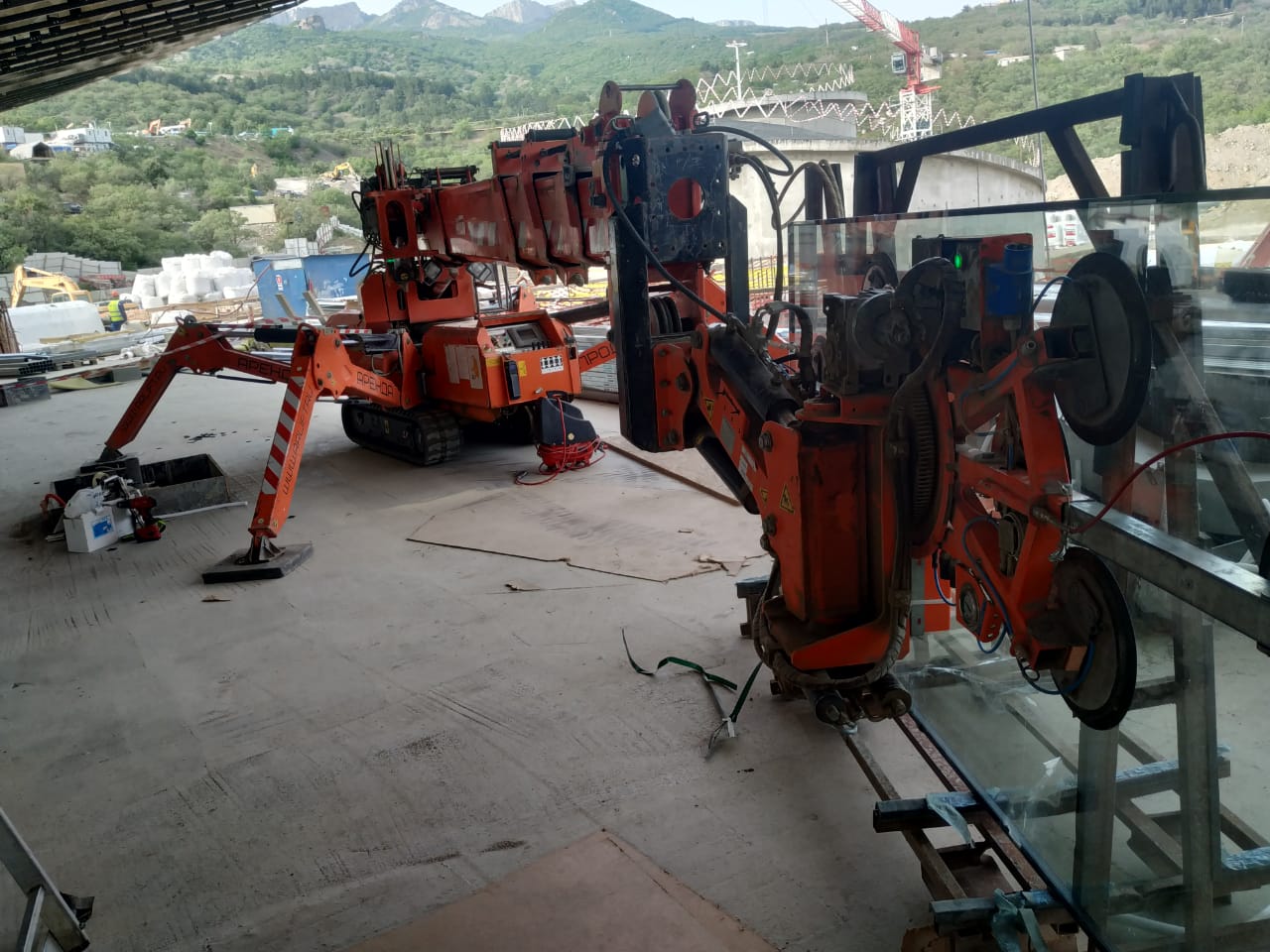 Несмотря на то, что обычно мини-кран работает в тандеме с вакуумным оборудованием, нельзя не отметить успешное сотрудничество и со стеклороботом. Маневренный, компактный, разработанный как для перевозки, так и для монтажа гладких поверхностей, он стал надежным помощником при выполнении работ. Помимо перевозки груза, стеклоробот имеет свой фронт работ и осуществляет монтаж стекол весом до 575 кг.
