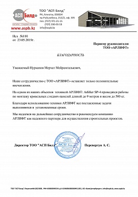 Благодарность от ТОО "NURLYTAU CONSTRUCTION"
