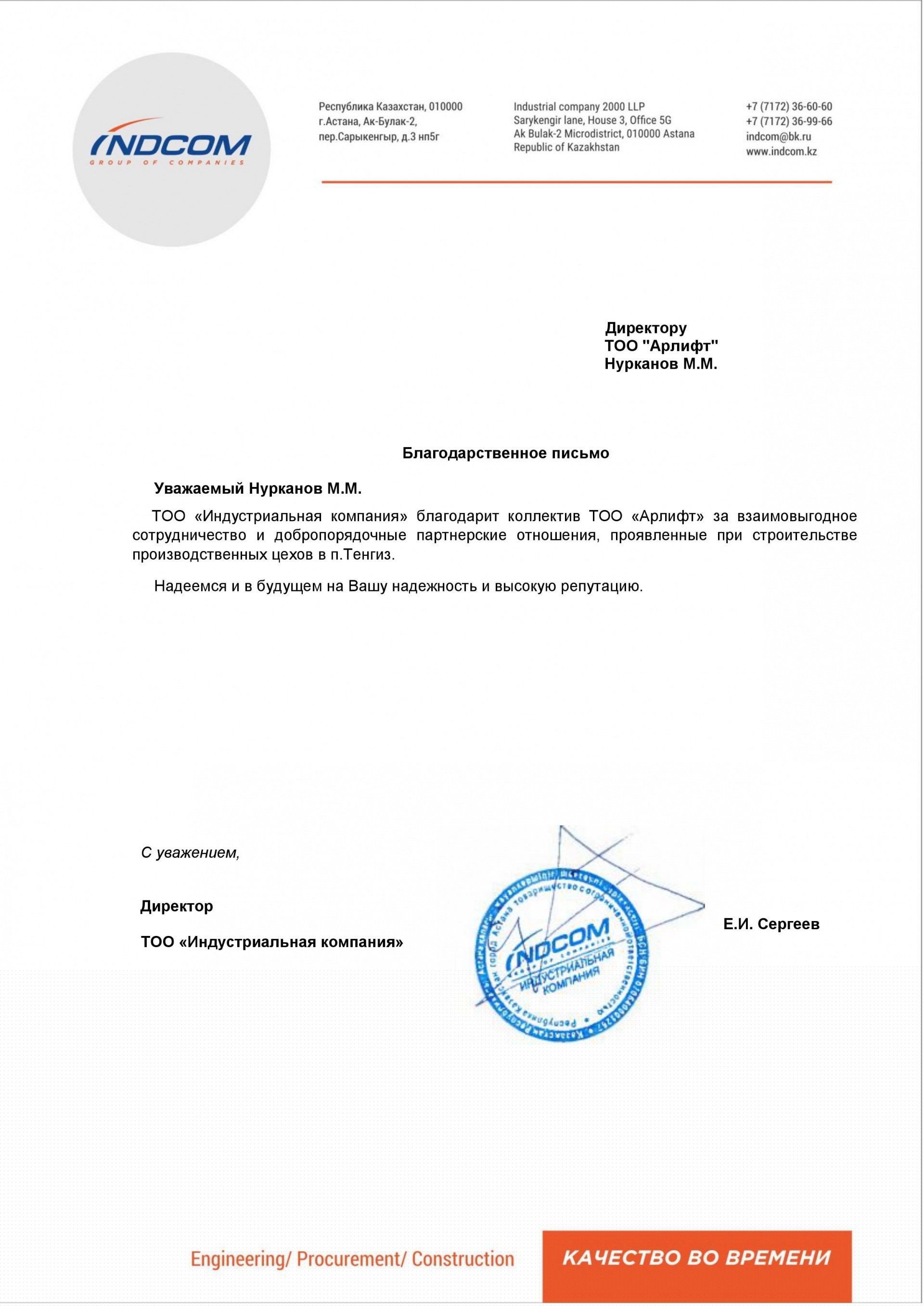 Благодарственное письмо от ТОО "Индустриальная компания"
